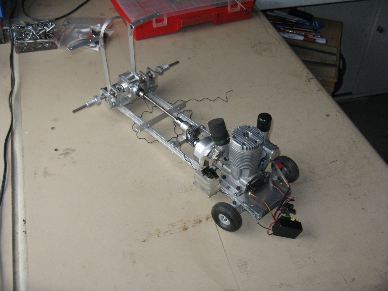 | In der Werkstatt des 1. Vorsitzenden wirbeln die Schlüssel!! Momentan wird an vielen verschiedenen Baustellen gearbeitet. Vasco verpasste dem Crazy Toy ein neues Body. Der neue Hulk bekommt eine externe Glühanlage zudem wurden die beiden einzelnen kleinen 30ml Tanks durch einen 100ml Tank ersetzt. Die umfangreichste Aufgabe ist jedoch der Multi Chaos. Das Modell soll zur Demo bei Agravis in Nartum zum ersten mal an die Kette! Ob ich das schaffe? Kann ich noch nicht sagen. Gerstern habe ich das Zugpendel sowie Hinterachse und Crossbox fertig aufgebaut. Heute kommen die ersten Motoren drauf. Drückt uns die Daumen! | |