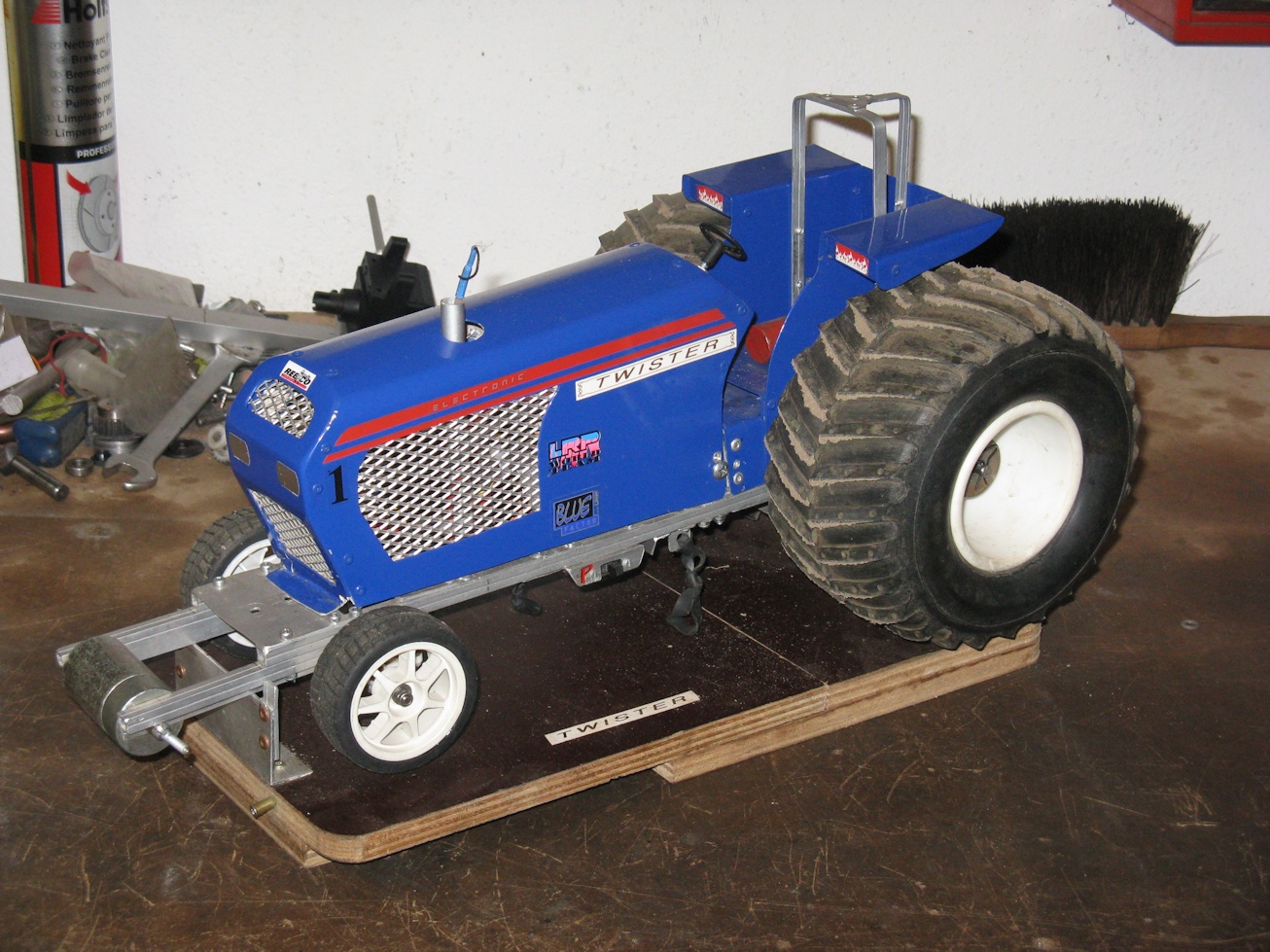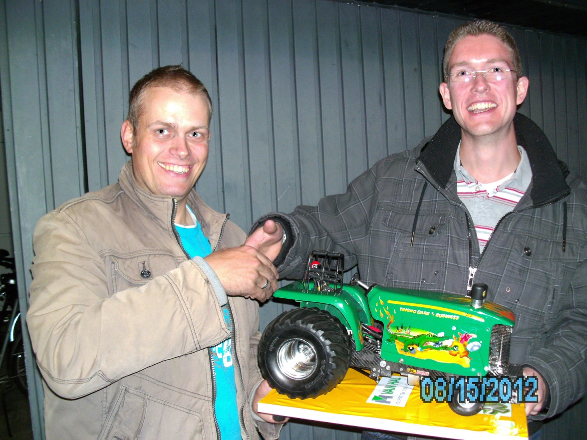 wird ein John Deere und als Antrieb dient ein Magnum 4takter mit 30ccm, Ich bin nun Mitglied im Team X-Treme und deshalb soll mein Neubau ein Schmuckstück werden wie der New Born Deere aus Anholt. Am Tier wird für die kommende Saison nicht viel verändert, eine weiter Verstrebung kommt in den Rahmen ein bisschen Farbe, neue Kotflügelund es wird eine neue Gewichtshalterung geben. Wenn der Superstock einigermaßen läuft und ich damit zufrieden bin, wird versucht auf dem Tier einen zweiten Motor aufzubauen. Der Motor der im vergangenen Jahr gefahren wurde läuft Links herum, ein rechts drehender Motor ist auch vorhanden und liegt in der Werkstatt. Diese Kombi könnte durch eine Crossbox mit nur einer Kupplung betrieben werde. Es wird jedoch sehr schwer dies in die 4,5kg zu bekommen, da die Motoren nicht gerade leicht sind (1,3kg). Das Tier kann in der jetzigen Form unter die ersten 3 fahren. Aber auch in der 3,5kg Freien Klasse sind es eher die sehr starke Mokis und Sönke die den Ton angeben werden.